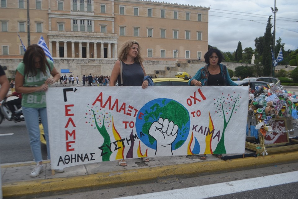 Την σκυτάλη πήραν το απόγευμα εκατοντάδες διαδηλωτές και διαδηλώτριες που συγκεντρώθηκαν στο Σύνταγμα. Πλήθος κόσμου με αυτοσχέδια πλακάτ και ζωηρά συνθήματα έδιναν τον τόνο. Ήταν εκεί με τα πανό τους: η Πρωτοβουλία ενάντια στην περιβαλλοντική καταστροφή και την κλιματική αλλαγή, περιβαλλοντικές κινήσεις για τη διάσωση των ρεμάτων, ο κοινοτικός συνδυασμός του Πειραιά Ενεργοί Πολίτες Α’ κοινότητας – Όχι λιμάνι στην Πειραϊκή, το ΠΕΡΙ.ΠΟΛ.Ο, ακτιβιστές και ακτιβίστριες από τις μάχες για την υπεράσπιση του Ελληνικού ανάμεσα τους και ο πρώην δήμαρχος Χρήστος Κορτζίδης, για το Πεδίον του Άρεως, το Πάρκο Γουδή, την Ακαδημίας Πλάτωνος και τον Κεραμικό, μέλη του Περιβαλλοντικού Δικτύου, του Περιβαλλοντικού και Φυσιολατρικού Συλλόγου Περιστερίου, οι Φίλοι της Φύσης, κλπ. Τα σωματεία των νοσοκομείων Άγιος Σάββας και Γεννηματάς, η Γ’ ΕΛΜΕ Αθήνας, εργαζόμενοι από τον Δήμο Αθήνας, αντιπροσωπεία από την Π.Ο. ΕΜΔΥΔΑΣ, την ΑΡΕΝ εκπαιδευτικών κλπ. Οι φοιτητικοί σύλλογοι των Μεταλλειολόγων και της ΣΤΕΦ Πανεπιστημίου Δυτικής Αττικής, οι μαθητές Anticapitalista και το Extinction Rebellion Youth. Δημοτικά και περιφερειακά σχήματα (Ανταρσία στις γειτονιές της Αθήνας, Ανυπόταχτη Αττική, Ανταρσία στο λιμάνι, Ανταρσία στην Κοκκινιά, Ανοιχτή Πόλη),. Οργανώσεις της αριστεράς όπως το Σοσιαλιστικό Εργατικό Κόμμα και η ΑΝΤΑΡΣΥΑ, η Συνάντηση για μια αντικαπιταλιστική διεθνιστική αριστερά, η ΣΣΠ –Μαθητική Αντεπίθεση, φεμινιστικές συλλογικότητες (Το Μωβ), η Οικολογική Συμμαχία, οι Οικολόγοι Πράσινοι, το ΜΕΡΑ 25.