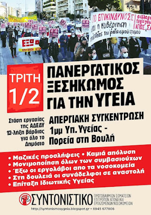 Στηρίζουμε την πανελλαδική στάση εργασίας και τα απεργιακά συλλαλητήρια για την υγεία την Τρίτη 1 Φλεβάρη (Αθήνα στο Υπουργείο Υγείας 1.00 μμ) και όλες τις μικρές και μεγάλες μάχες για τις ανάγκες και τα δικαιώματά μας.
